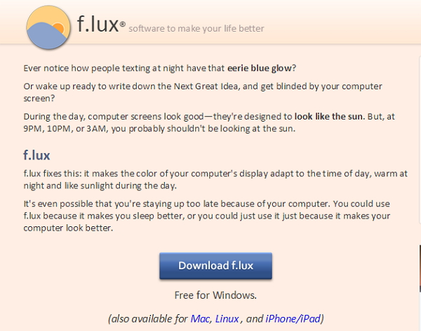 F.lux 是一款可以在 Windows、Mac、Linux 上運作的一款軟體。(圖片來源/F.lux )
