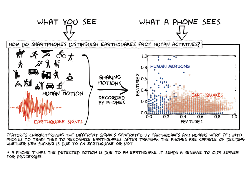 利用三軸震動數據,可以得出目前的震動狀態為何。研究團隊表示,雖然智慧型手機內的感測器不如標準的地震偵測儀器,有著精密的測量裝置與精確的分析結果,但這款 App 仍然可以分析出 10 公里距離內、規模 5 級以上的地震。