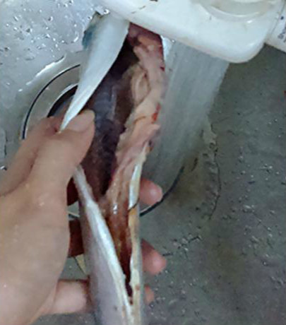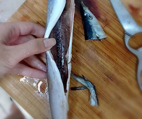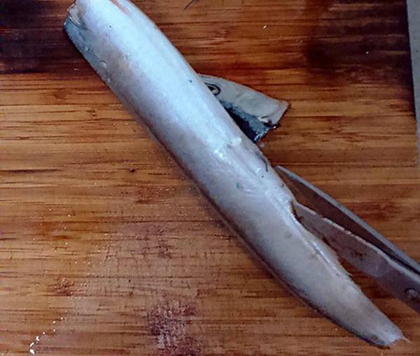 2.把秋刀魚中間的龍骨整條拿出。